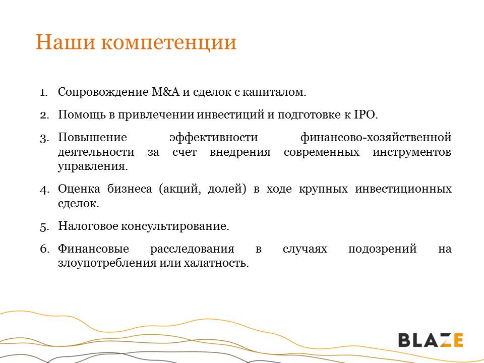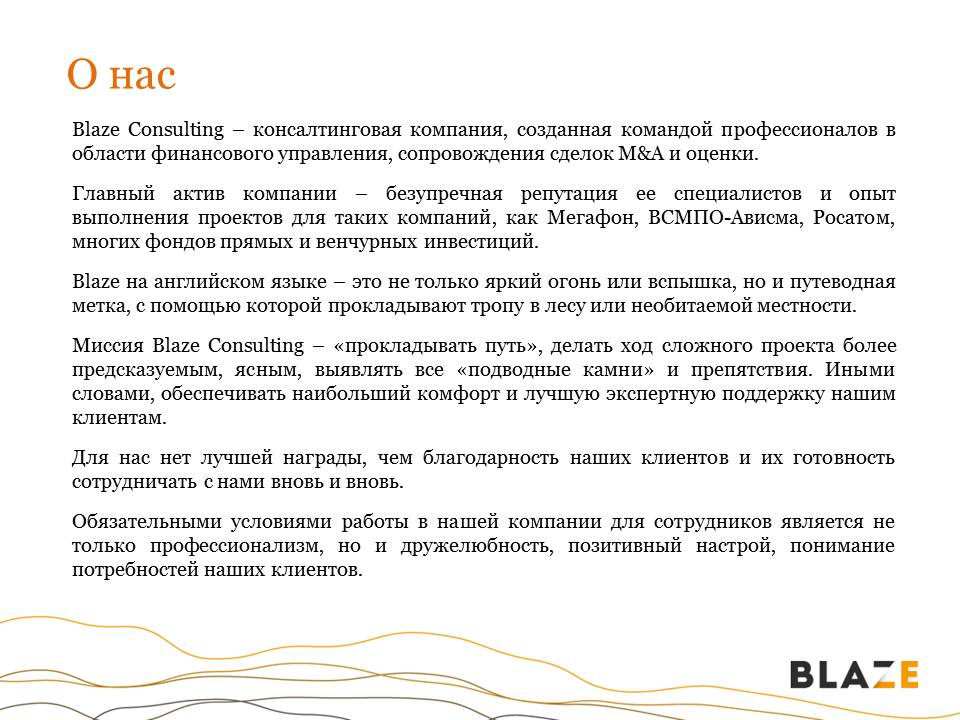 Мы, компания Блейз Консалтинг, оказываем поддержку нашим клиентам в проведении инвестиционных и M&A сделок. По итогам прошедшего года мы в очередной раз вошли в ТОП-5 рейтинга консультантов аналитического агентства mergers.ru по числу сделок. Также мы оказываем услуги оценки бизнеса, инвестиционно-финансового и налогового консультирования.